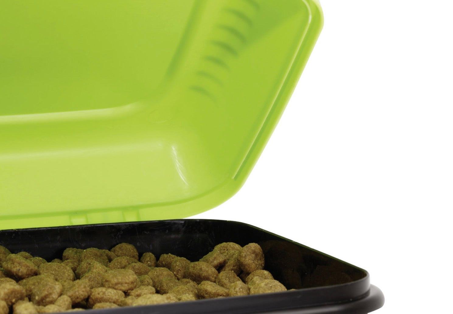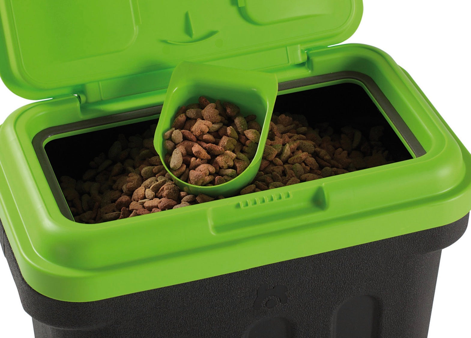 Zur Entnahme des Trockenfutters öffnen Sie einfach den Sicherheitsverschluss am Deckel und entnehmen das Trockenfutter mit der Hilfe der sich an der Deckelinnenseite verstaubaren Dosierschaufel.