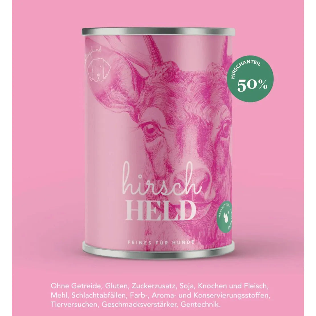 50 % Hirschfleisch, 15 % Kartoffeln, 11 % Zucchini, 6 % Apfel, 5 % Birne, dazu Karotten, Rote Beete, Spinat, Joghurt, Olivenöl.