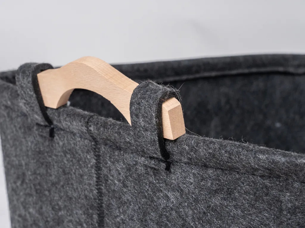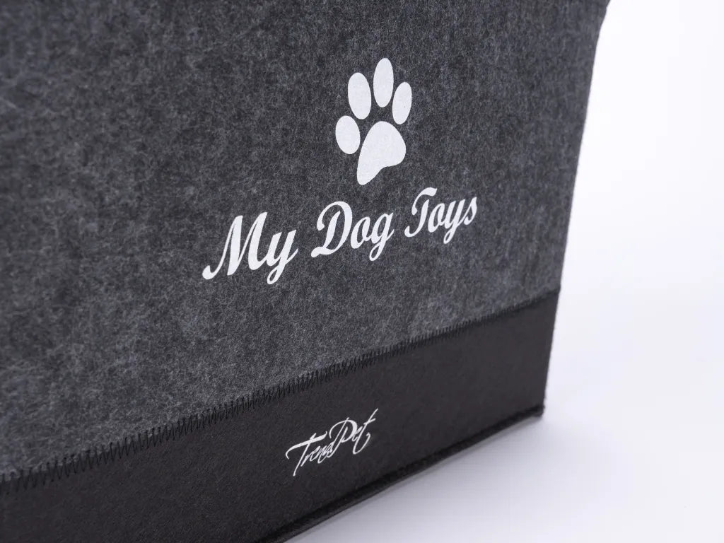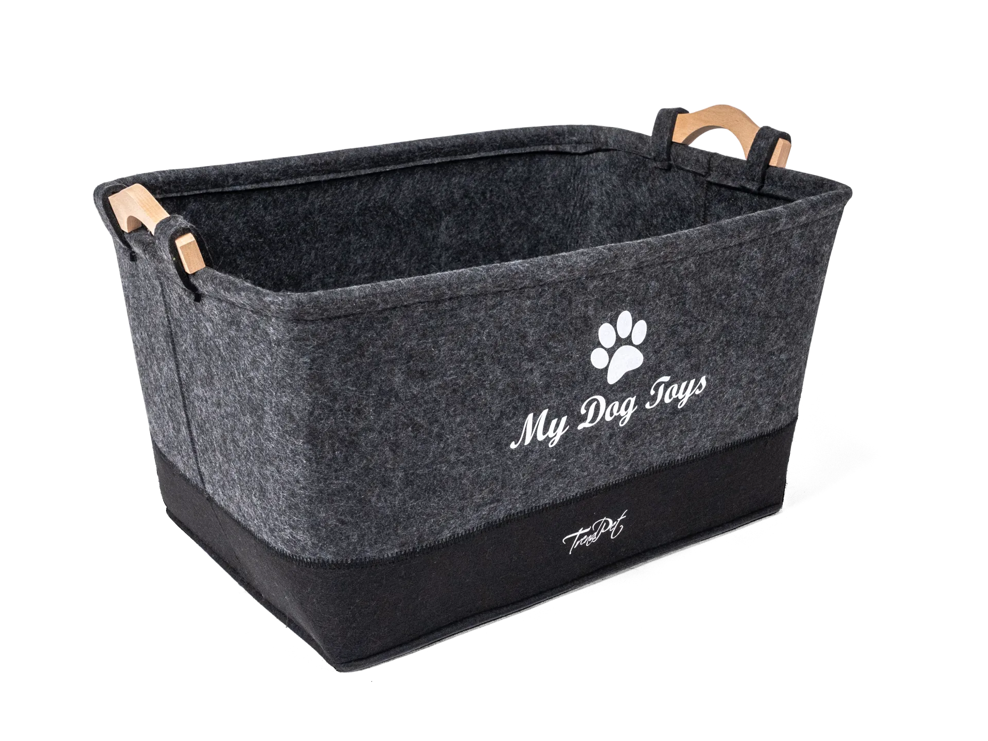 My Dog Toys punktet mit seinem schlichten Design. Die grau-anthrazitfarbene Kombination des Filzstoffes und die Holzgriffe lassen den Korb gemütlich wirken und geben dem Raum eine zusätzliche wohnliche Note.